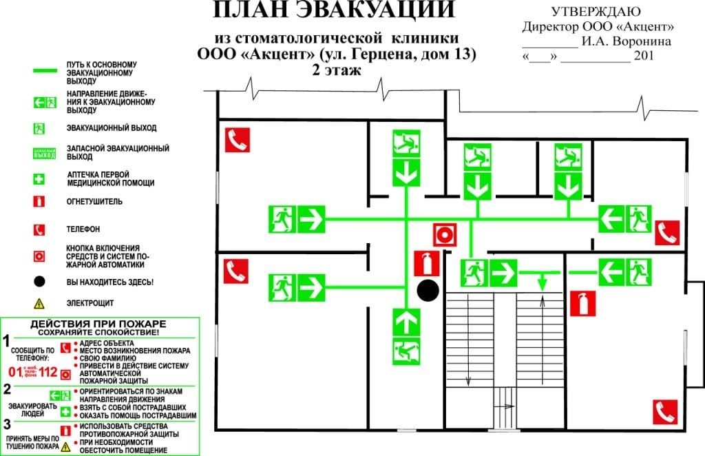 Текстовая часть планов эвакуации должна содержать инструкции о действиях в условиях пожара:
