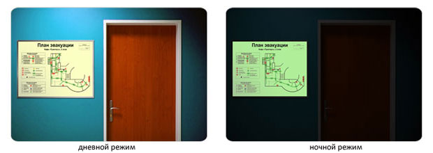 В соответствии с требованиями нормативных документов, планы эвакуации должны быть фотолюминесцентными с временем свечения не менее 24 часов.